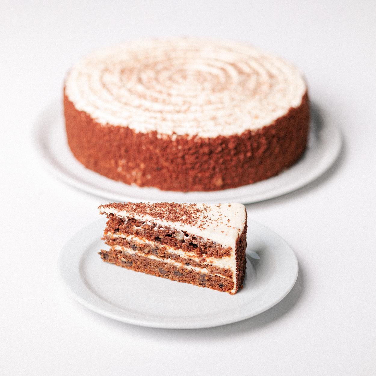 Nuestra versión de tarta de zanahoria con cacao puro, trocitos de chocolate, clavo de olor, canela y jengibre, rellena de una deliciosa crema de queso poco dulce y ligeramente ácida. La preferida de los que prefieren bizcochos especiados.
