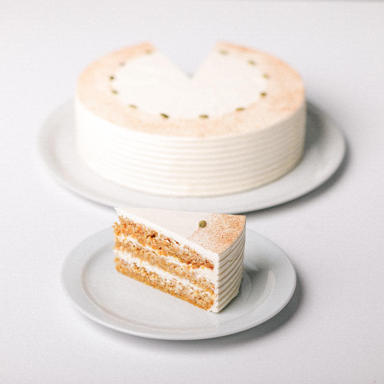 Nuestro carrot cake artesano con ingredientes naturales y sin nueces, relleno y cubierto con un suave frosting de queso crema